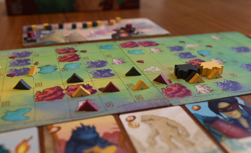 In Creature Caravan, players build a card tableau of creatures while traveling through a magnificent and dangerous land. Players take turns simultaneously, placing dice on actions on their cards, moving their caravan on the map, and playing new creature cards. Players also compete to trade goods and rare coins in a shared market, search the mysterious white towers, and fight ember zombies as they travel. The game ends when one player reaches Eastrey. The player with the most points wins.