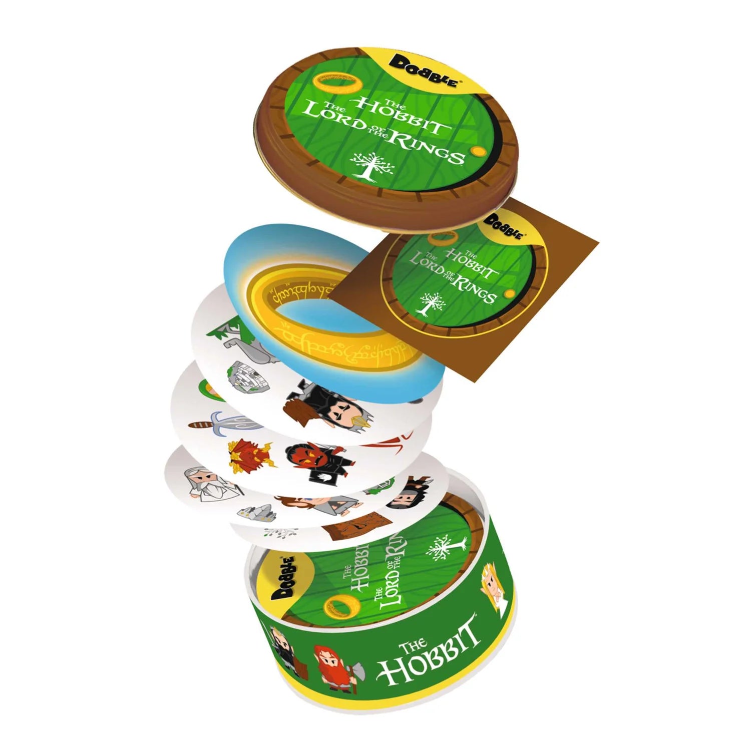 Simple, fun, fast: Dobble is the ultimate game of observation and speed for everyone! Be the fastest to name the only common symbol between 2 cards to win a card or get rid of it. With 5 game varients, every game will be different! Frodo, Sam, Gandalf, Smaug: find the iconic characters and objects from the world of The Hobbit and The Lord of the Rings on 56 illustrated cards! Will you be the one to find The One Ring?