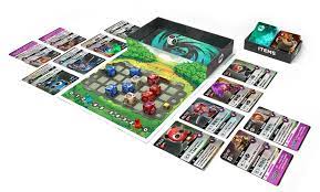Battles take place within the Arena, a raised-punchboard 4×7 grid that is anchored right onto the lid of the game box.